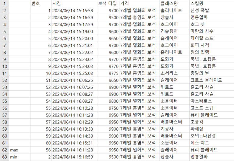 wb = Workbook() ws = wb.active ws.title = "로스트아크 7레벨 보석 가격 변화 추이" # 헤더 추가 ws.append(["", "번호", "시간", "보석 타입", "가격", "클래스명", "스킬명"]) # 보석 정보 추가 for i, value in enumerate(jewel_info_list): ws.append(value) # 열 범위 설정 (B~G) columns = [chr(i) for i in range(ord('B'), ord('H'))] lenth = len(jewel_info_list) + 1 # MAX 값 수식 입력 max_value = ([f"=INDEX({col}2:{col}{lenth}, MATCH(MAX(D2:D{lenth}),D2:D{lenth}, 0))"\ for col in columns]) max_value.insert(0, "max") ws.append(max_value) # MIN 값 수식 입력. min_value = ([f"=INDEX({col}2:{col}{lenth}, MATCH(MIN(D2:D{lenth}),D2:D{lenth}, 0))"\ for col in columns]) min_value.insert(0, "min") ws.append(min_value) # 엑셀 파일 저장 wb.save("lostark_jewel_test.xlsx") - excel파일로 저정하기 (max, min 을 Lambda 함수로 직접 추가하기)