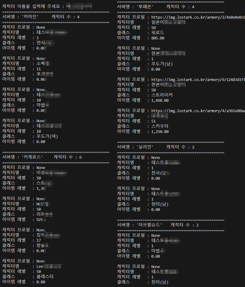 for key, value in char_info_list.items(): print("==================================================") print("서버명 : {!r:10s} 캐릭터 수 : {}".format(key.replace("'", ""), len(value))) print("==================================================") for character in value: # 캐릭터 이미지 가져오기 ### 3번 내용 입력하기 ### # 캐릭터 정보 출력 print("캐릭터 프로필 : {}".format(profile_image)) print("캐릭터명 : {} ".format(character['CharacterName'])) print("캐릭터 레벨 : {} ".format(character['CharacterLevel'])) print("클래스 : {} ".format(character['CharacterClassName'])) print("아이템 레벨 : {} ".format(character['ItemMaxLevel'])) print() - 결과 확인