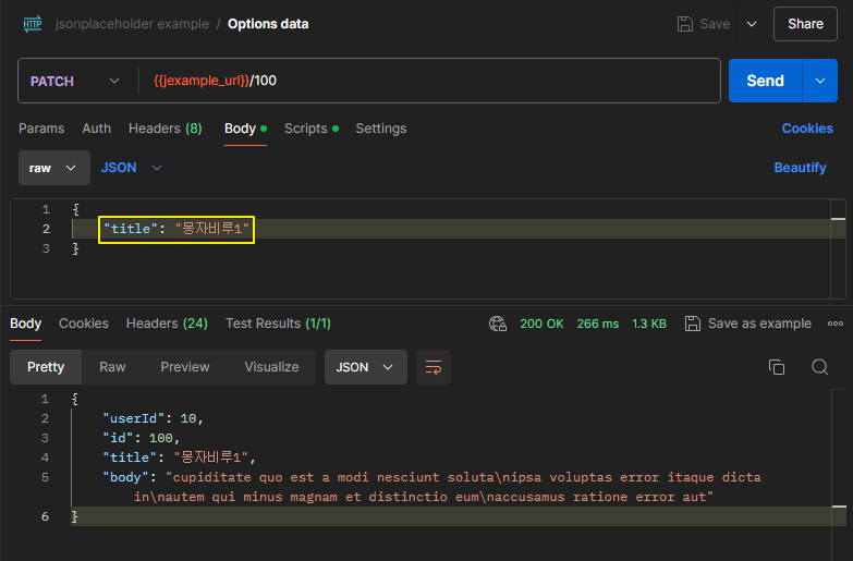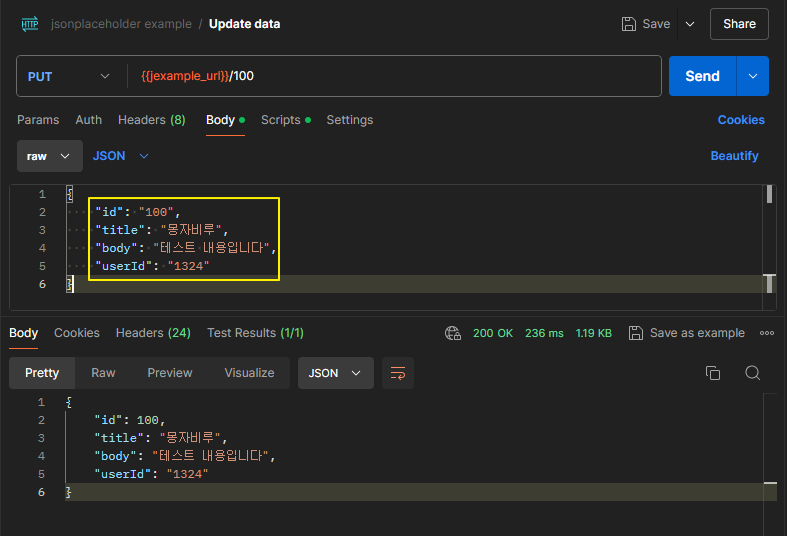 - 요청의 본문(body)에 변경할 데이터와 변경하지 않을 데이터를 전부 포함