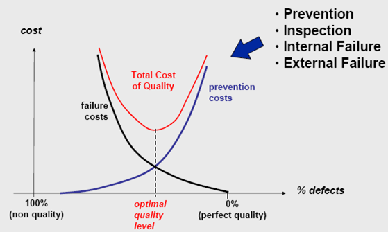 전통적 품질 모델은 실패비용과 예방비용이 서로 반비례의 관계를 가지고 있어, 최적의 품질비용 선이 있었다.