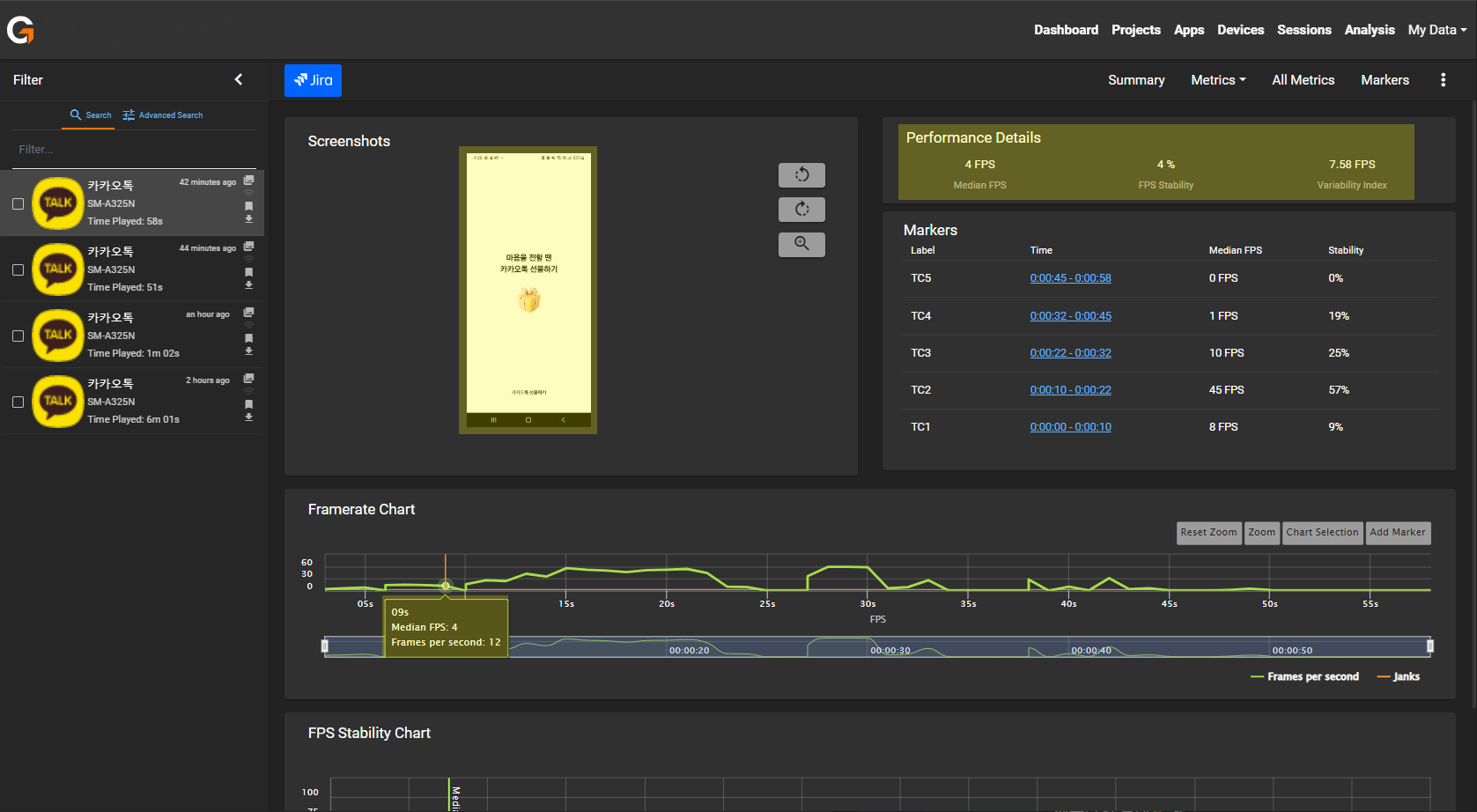 - 그래프의 각 지점을 클릭하면 해당 지점의 녹화 당시 화면 캡처 정보가 노출된다.