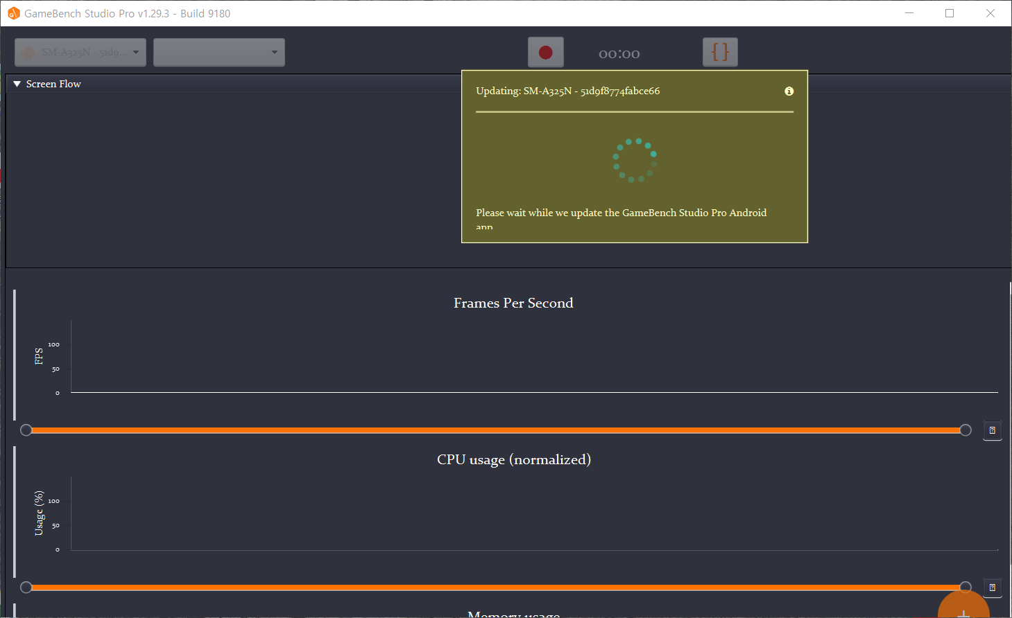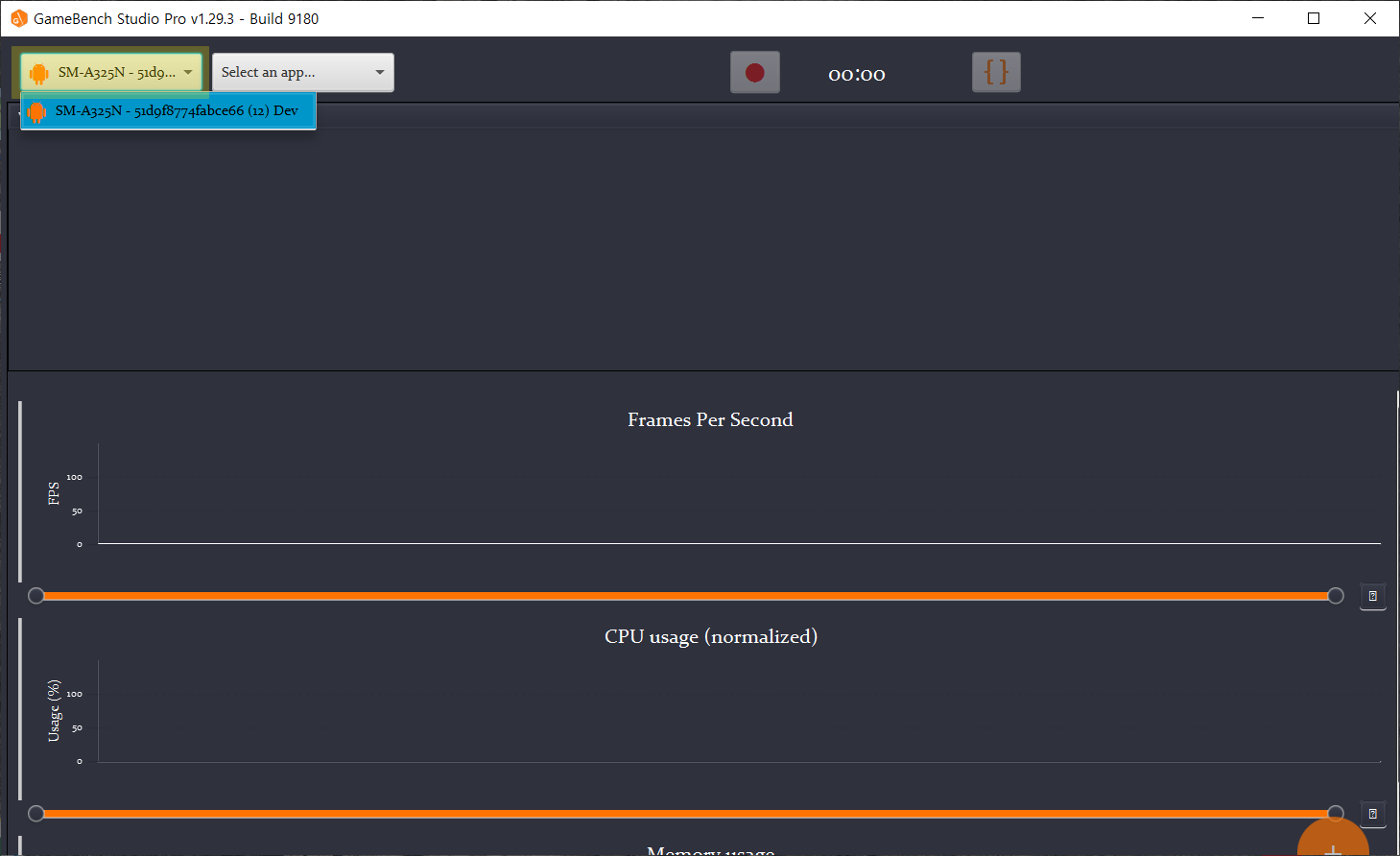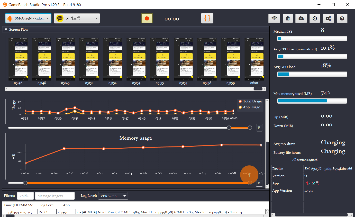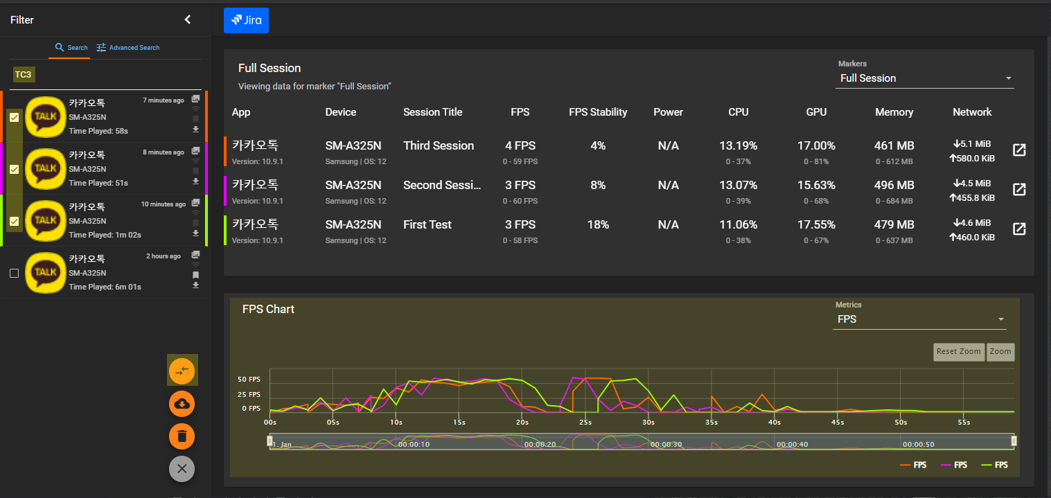 - 중앙 차트에는 프레임 속도와 CPU사용량, 메모리 사용량이 실시간으로 표시된다.