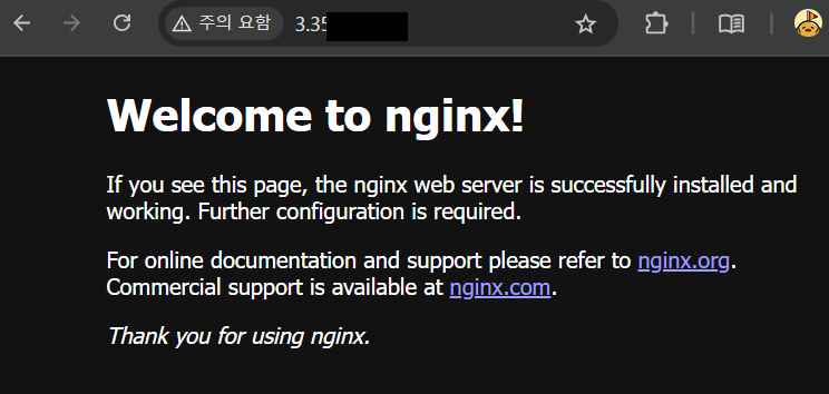- 80번 포트에서 nginx 페이지 노출 확인 (도메인으로 접속해도 동일)