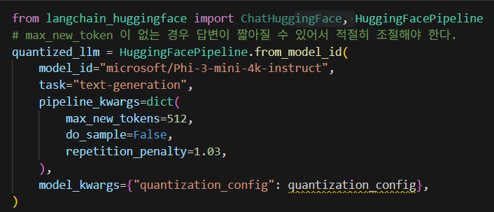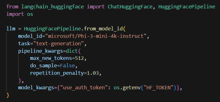 여기서 HuggingFacePipeline 을 생성하는데, 모델은 `microsoft/Phi-3-mini-4k-instruct` 를 사용한다.