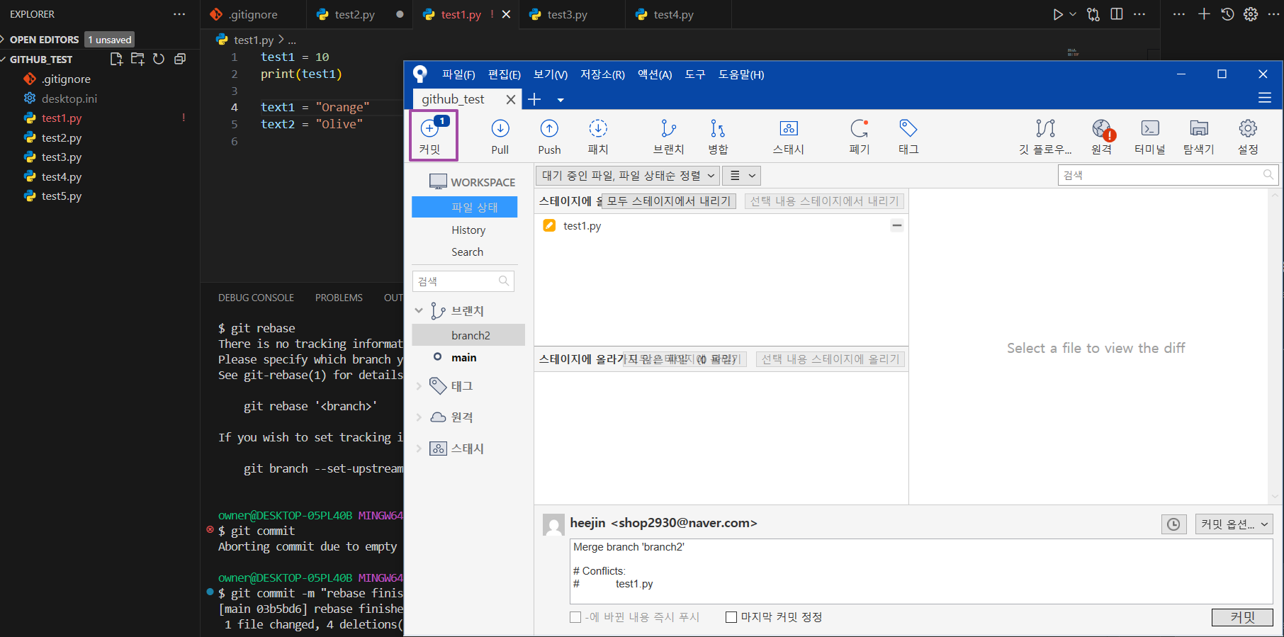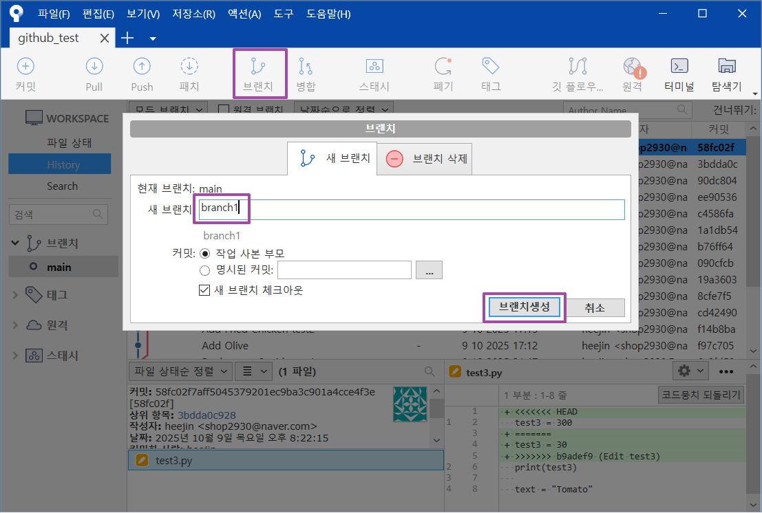 예를 들어서 main branch 에서 test1.py 내 test1 변수 값을 100으로 변경하고,