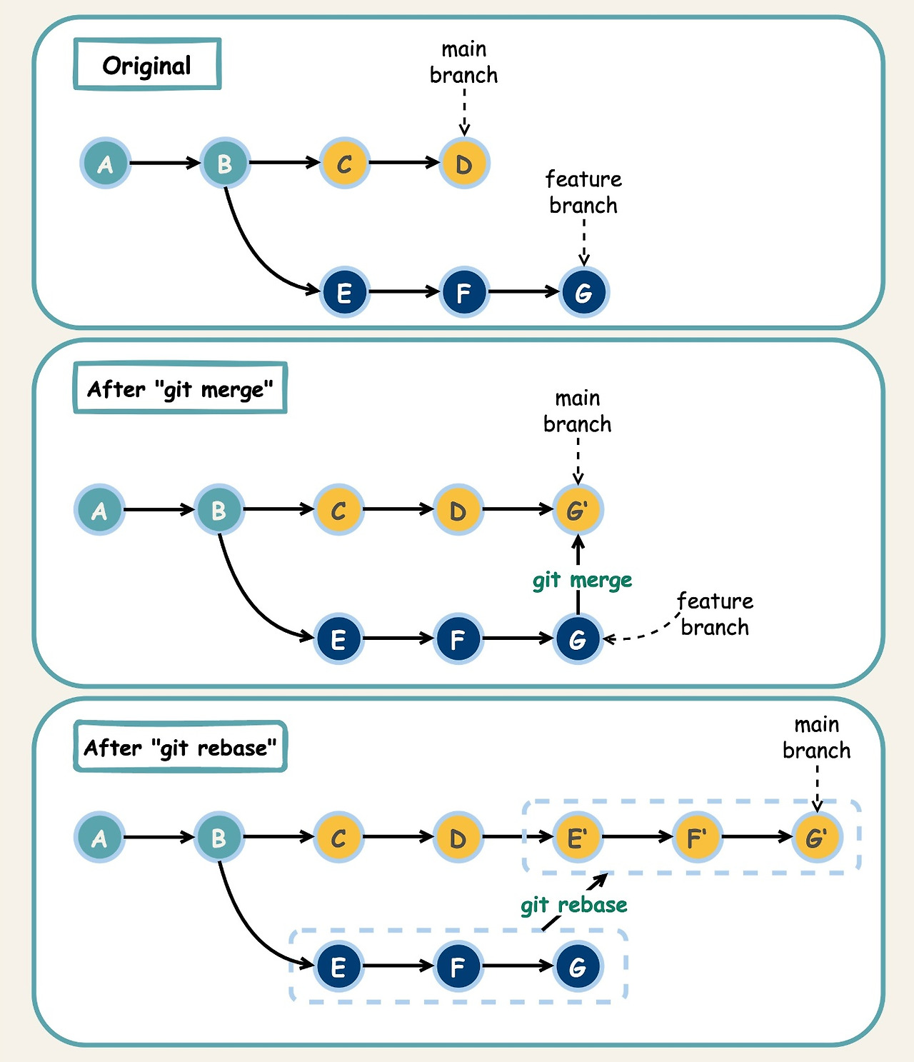 이렇게 분리된 branch를 main branch에 합칠 때 두가지 방법이 있는데, merge 와 rebase 이다.