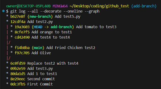 그래서 여러 branch의 내역을 확인하고 싶을 때는 git log --all --decorate --oneline --graph 를 사용한다.