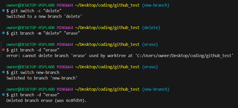 지워질 브랜치에만 있는 내용의 commit 이 있는 경우, -d 대신 -D 를 사용하여 강제 삭제해야 한다.