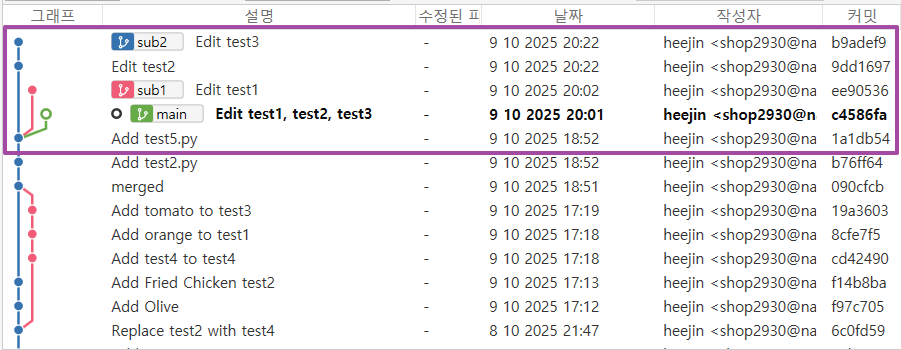 위와 같은 경우라고 예상하고 이때 main과 sub1을 merge하면 아래와 같이 나온다.