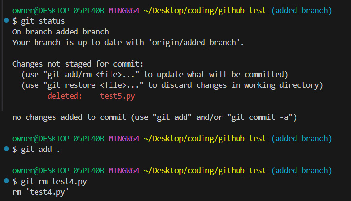 먼저 work directory에서 파일을 삭제한 상태로 git add . 까지 진행한 상태가 git rm 이다.