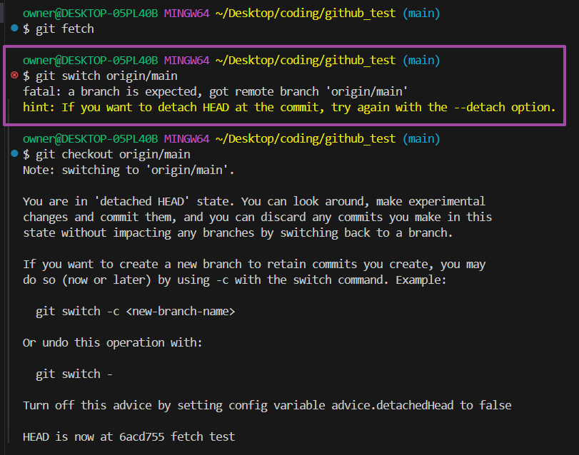 여기서 주의사항이 있는데, git switch origin/main은 진행해도 아래처럼 에러가 발생할 수 있다.