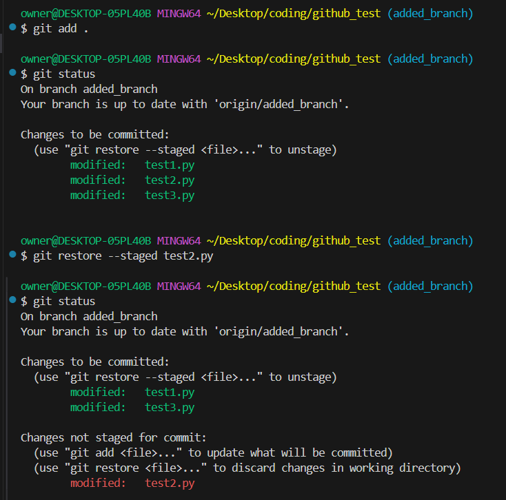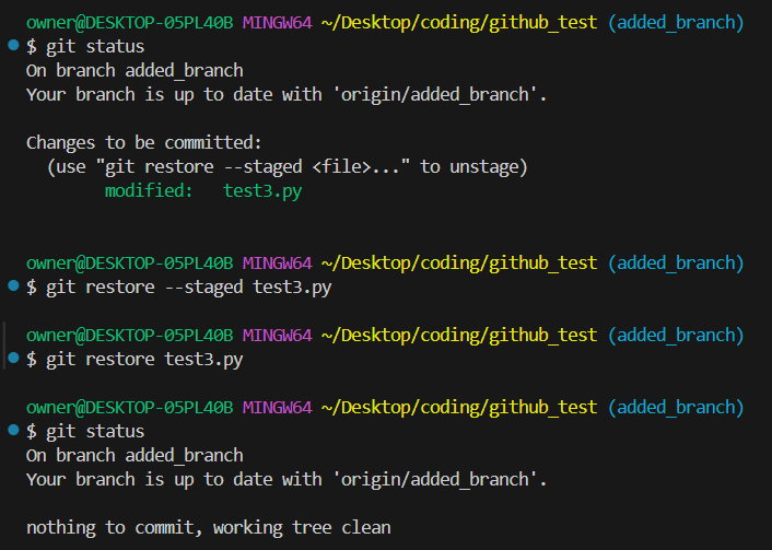 여기서 git restore --staged "file name" 을 입력하면 스테이지 상태에 올린 파일을
