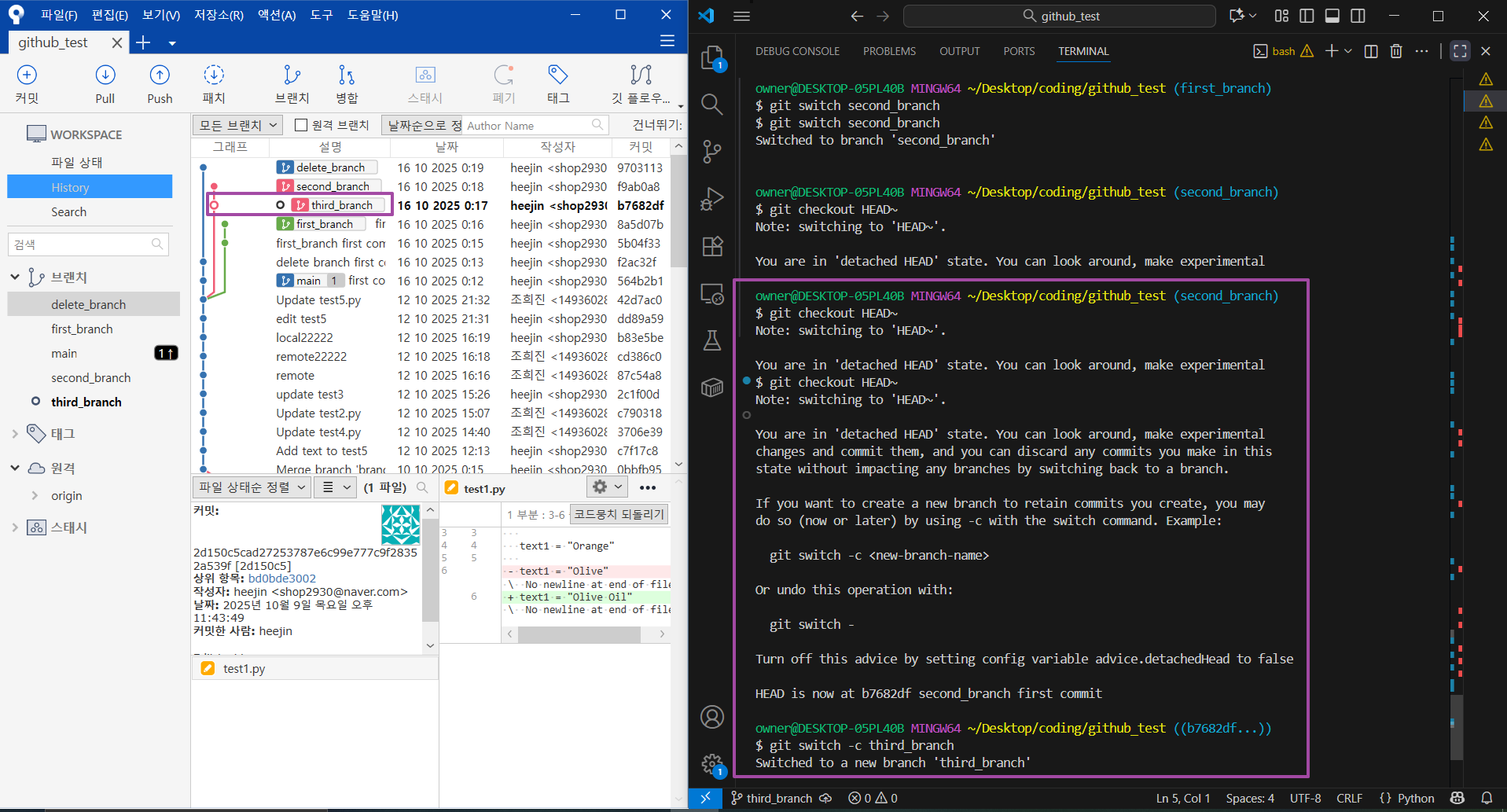 즉, 익명의 브랜치를 만든것과 동일한 상태로, 다른 branch로 이동하기 위해서는 git switch를 한다.