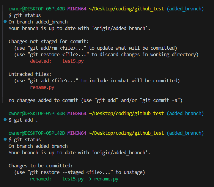 여기서 git add . 를 진행한 뒤에 git status를 확인하면 그제야 파일 이름이 변경된 것으로 인식한다.