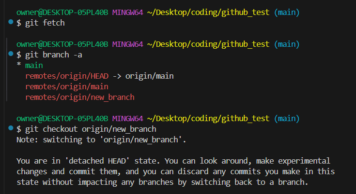 이후 git checkout origin/new_branch 를 진행하면 해당 branch의 변경내용을 확인할 수 있다.