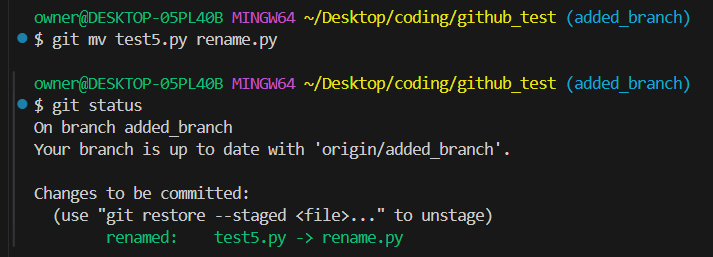 그렇다면 git mv "before file name" "after file name" 을 진행하면 파일명을 변경한 뒤