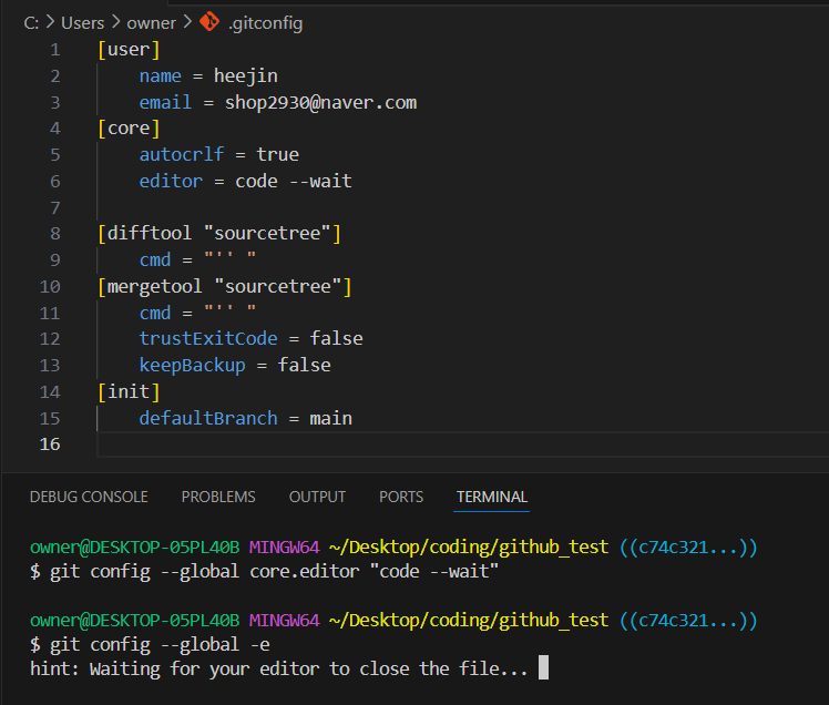 VS code 에서 git config --global -e 를 입력했을 때, VS code 로 열리게 된다.