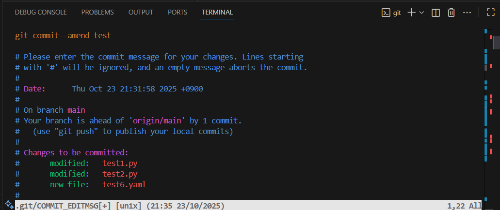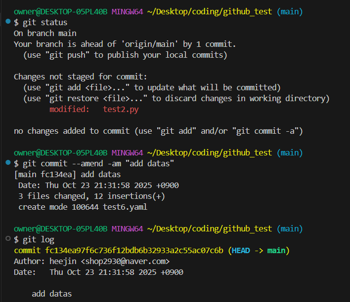 여기서 커밋 메시지를 입력하고 저장하면 이전 commit message가 수정되면서 추가한 내용도 포함된다.