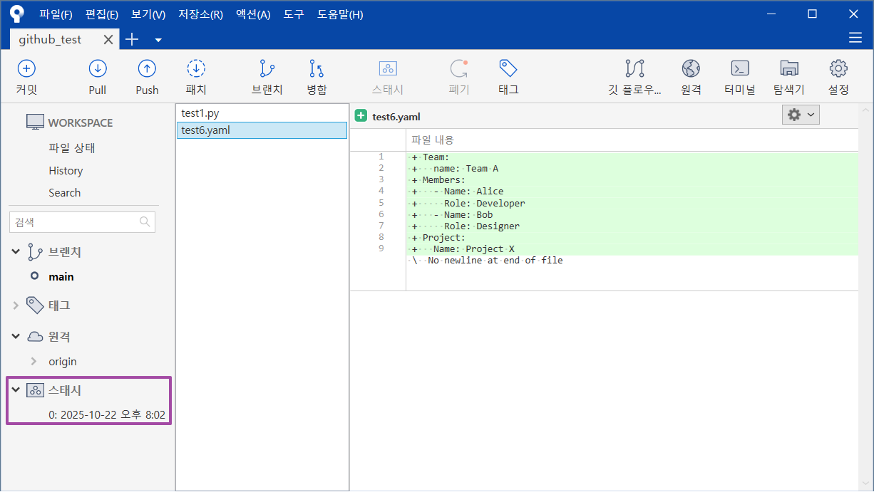해당내용은 sourcetree에서 확인해보면 스태시라는 공간에 노출되는 것을 볼 수 있다.
