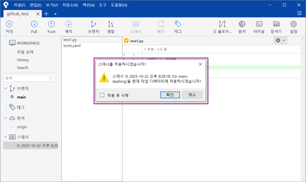 스태시 목록을 우클릭한 뒤 스태시 적용 버튼을 누르면 다시 파일에 적용시킬 수 있다.