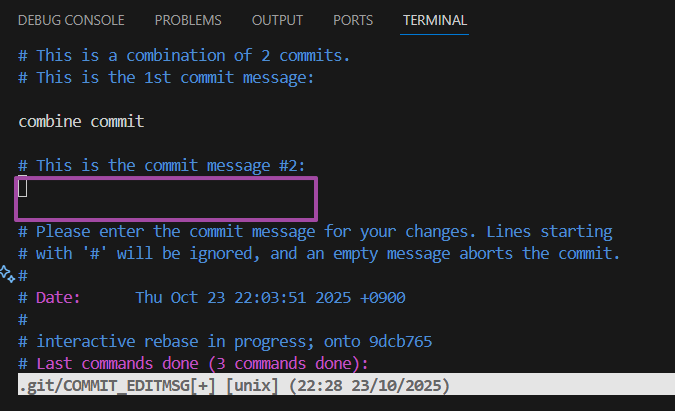 이때 combine commit은 2 에 s를 입력해야 앞에있는 combine commit1 과 합쳐질 수 있다.
