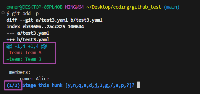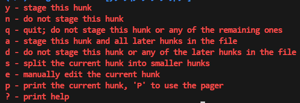 그럴 때 git add -p 를 입력하면 아래와 같은 페이지로 이동하게 되고 여기에서 보이는 부분 중