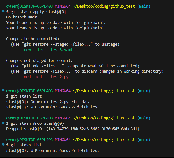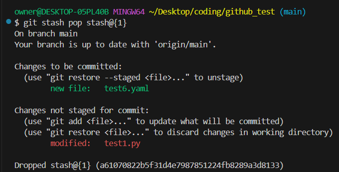git stash pop stash@{n}을 입력하면 특정 stash에 대해 두가지 액션을 한번에 할 수 있다.