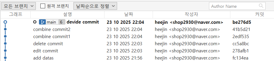먼저 commit 의 목록은 위와 같고 먼저 add datas에 대한 commit hash를 기억한 다음에,
