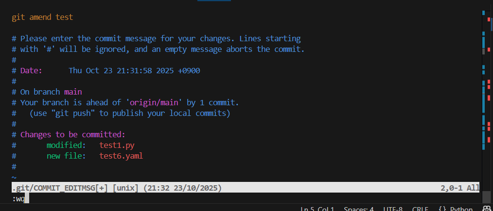 이후 commit message를 변경한 뒤 :wq 로 저장하면 git commend가 수정된다.