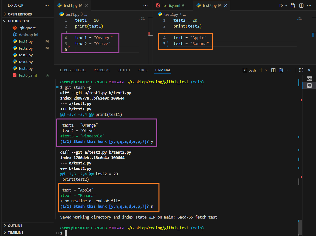 여기에서 y를 하는 항목만 stash로 이동되고 나머지는 local에 유지되는 것을 볼수있다.