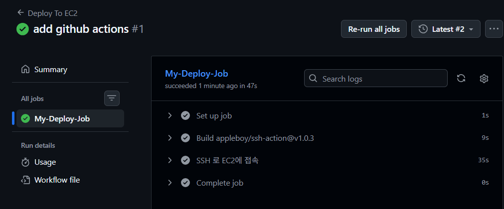 이제 git push 를 진행한 뒤에 Actions 에서 확인하면 아래와 같이 성공한 것을 볼 수 있다.