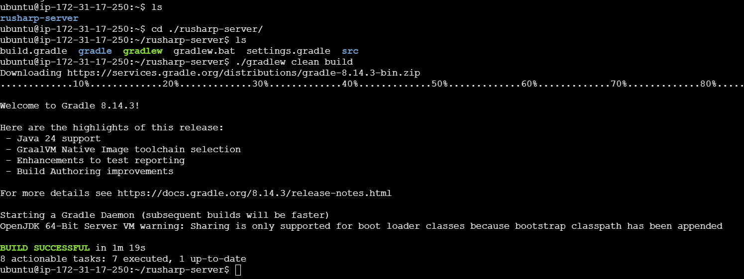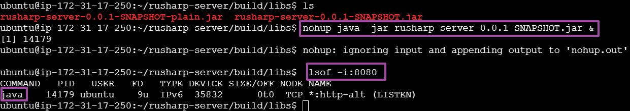 이후 /build/libs 하위에 rusharp-server-0.0.1 SNAPSHOT.jar 파일을 nohup java -jar [filename] & 으로 실행시킨다.