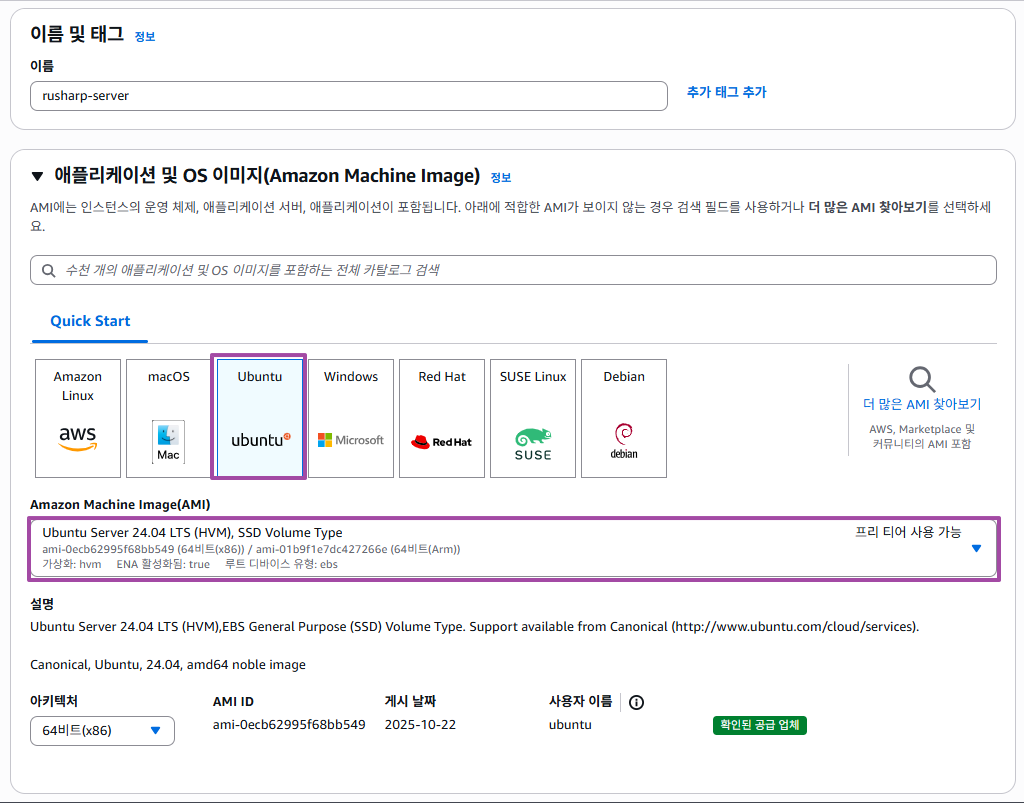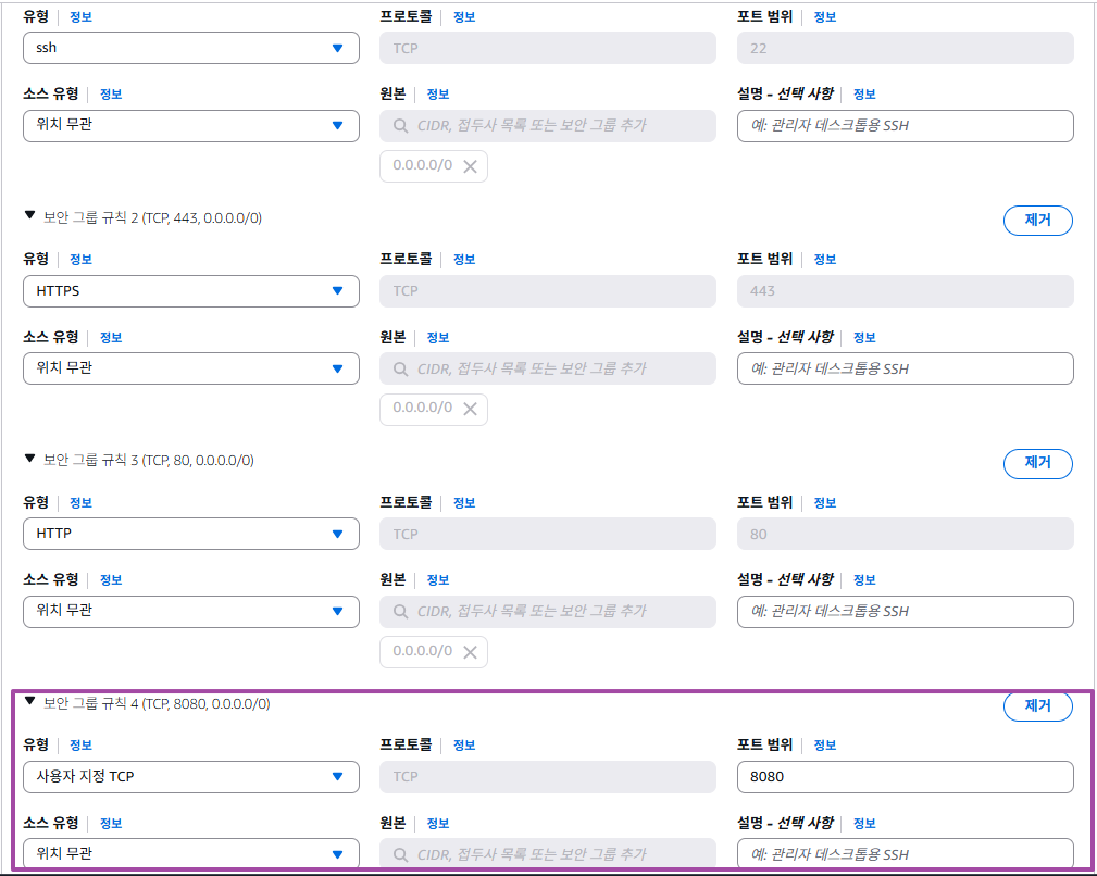 그 다음으로 AWS 에서 EC2의 인스턴스를 시작하고, 아래와 같이 설정했다.