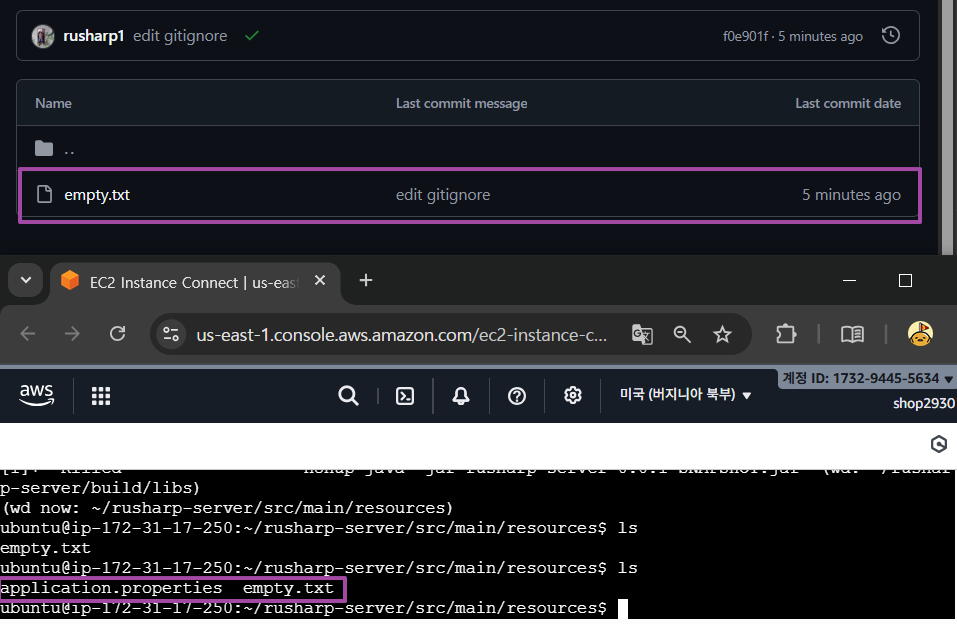 그러면 아래와 같이 github 에서는 application.properties 파일이 없지만 EC2에서는 해당 파일이 존재한다.