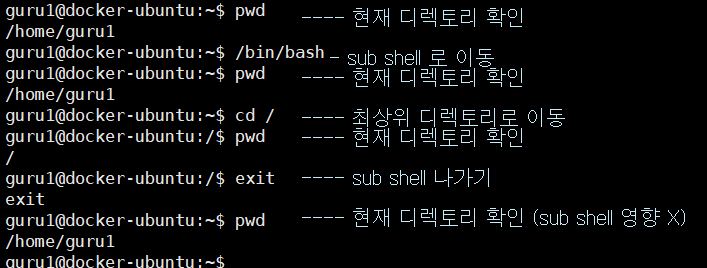 - sub shell 안에서 일어난 명령어들은 현재 디렉토리에 영향을 미치지 않음
